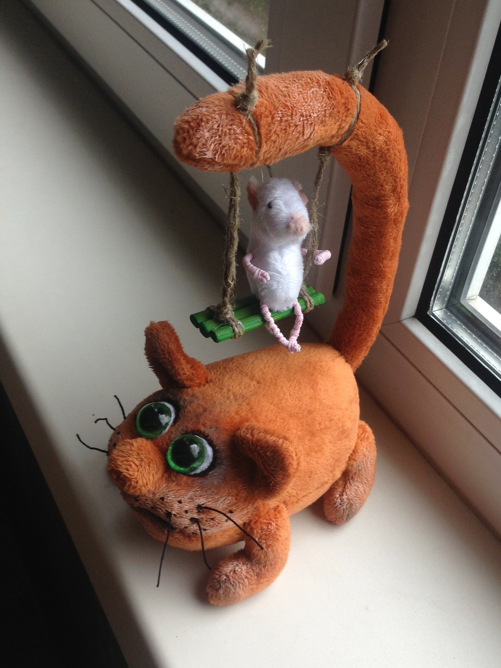 Милая парочка выполнена из плюша. Внутри кота проволочный каркас, качели прикреплены, мышь на качельках приклеена. Возможно выполнение в других цветах, в других размерах, с большим количеством мышей!