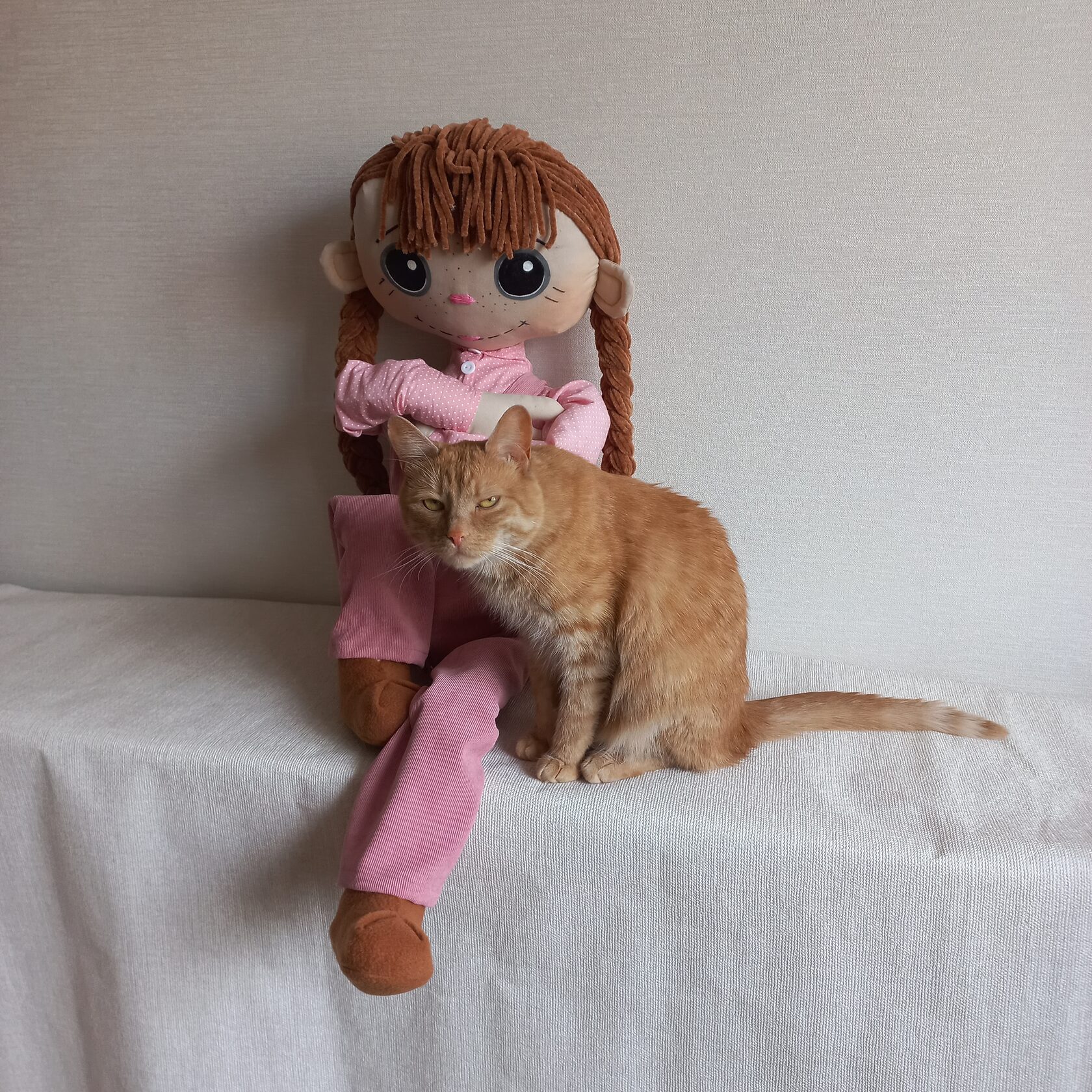 Лён, трикотаж, искусственный мех, вельвет, ситец, флис, поролон, клей, синтепух, тонирующие мелки.Размер: высота 150 см
