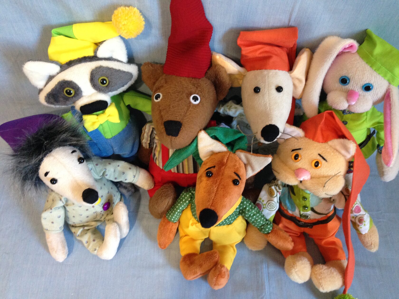 В коллекции персонажей- заяц, кот, мышь, медведь, ежик, лиса. На спинках игрушек будут пришиты специальные петельки-водилки.